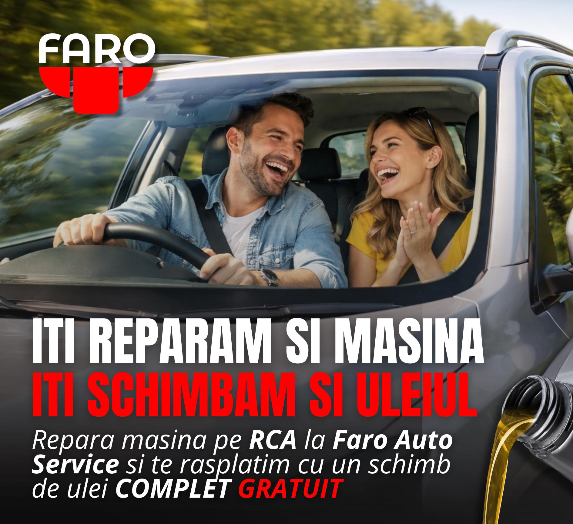 Dacă ai o daună auto evaluată la peste 5.000 lei și repari mașina prin RCA la FARO Auto Service, îți oferim schimbul de ulei COMPLET, gratuit, efectuat în timpul reparației.